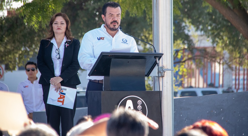 En su mensaje a la comunidad universitaria, el rector destacó la importancia de preservar el respeto a los símbolos patrios, y reiteró el compromiso de la UAT por engrandecer a la nación a través de la educación.