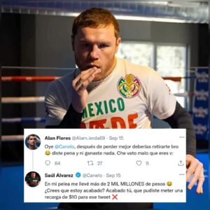 Esto lo menciono por la respuesta qué, él, da en «X» a un aficionado que le pone un comentario después de la pelea con Crawford; Canelo le respondió tratando de avergonzarlo suponiendo que este aficionado no tiene recursos económicos ni para costear su teléfono celular. Respuesta p3nd€j@, tomando en cuenta que esta persona se refiere a El, cómo boxeador.