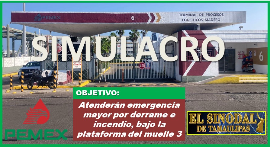Ciudad Madero, Tamaulipas. – Como parte de la aplicación y evaluación del plan de respuesta a emergencias interna y externa, la Terminal Marítima Madero de Petróleos Mexicanos (Pemex) llevará a cabo el viernes 26 de septiembre un simulacro de emergencia mayor por derrame e incendio bajo plataforma del muelle 3, derivado de un acto de sabotaje.