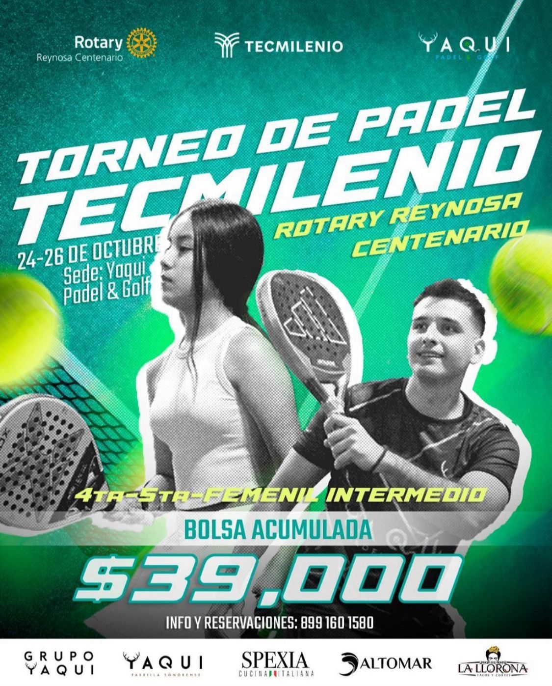 “Habrá una bolsa de 39 mil pesos y se jugará por parejas o en forma individual, para mayor información se pueden comunicar al 899 160 15 80, donde se brindaran más pormenores, por lo pronto anticipamos qie y se aplicara reglas de la Federación Internacional de Pádel”, apuntó el presidente del Club Rotarios Centenario, Alberto Mora.