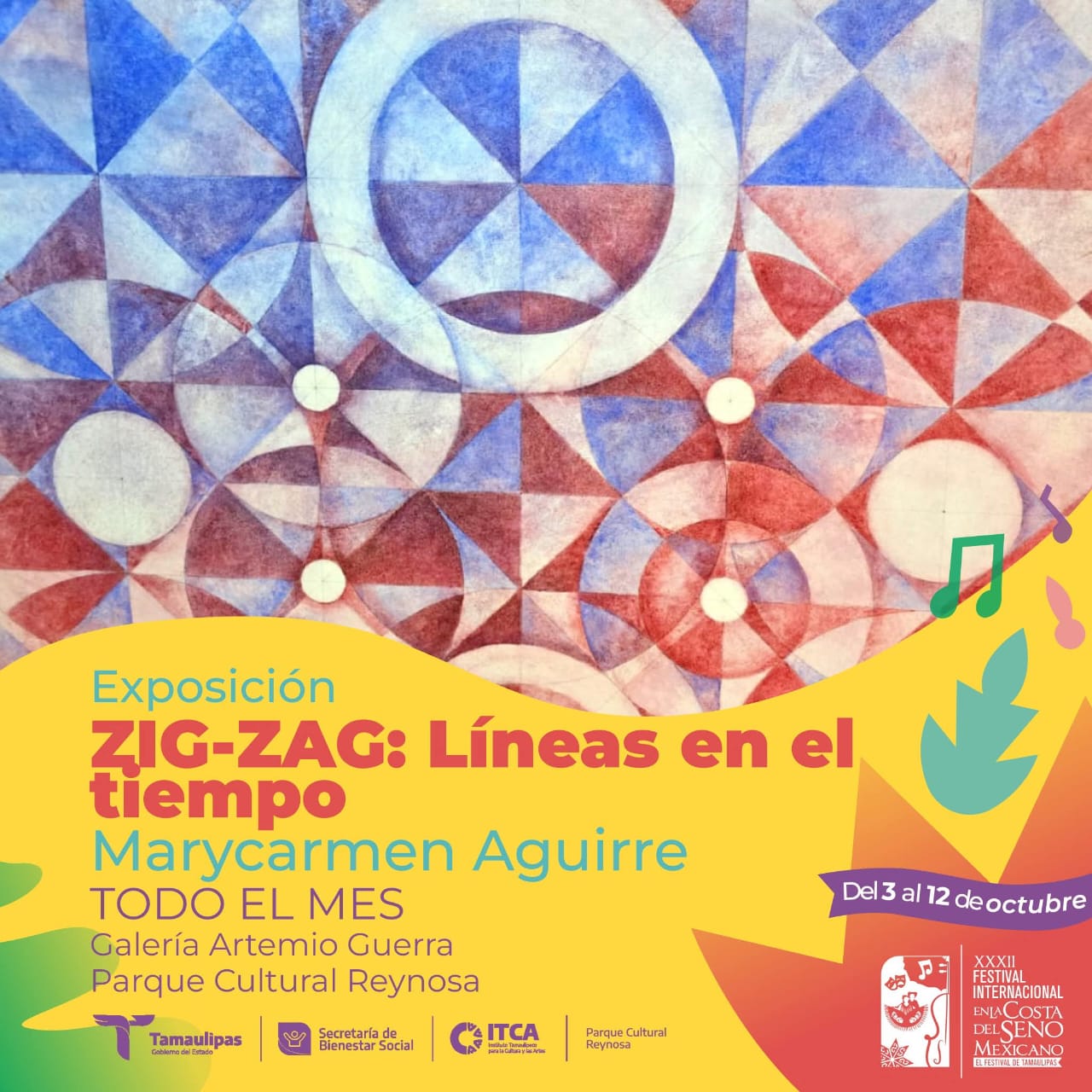 Reynosa, Tam.- El Gobierno del Estado de Tamaulipas, a través de la Secretaría de Bienestar Social Tamaulipas y el ITCA Tamaulipas, en colaboración con el Parque Cultural Reynosa, invitan a la inauguración de la exposición “ZIGZAG, líneas en el tiempo” de la artista Marycarmen Aguirre, que se llevará a cabo el sábado 4 de octubre a las 18:00 horas en la Galería Artemio Guerra.