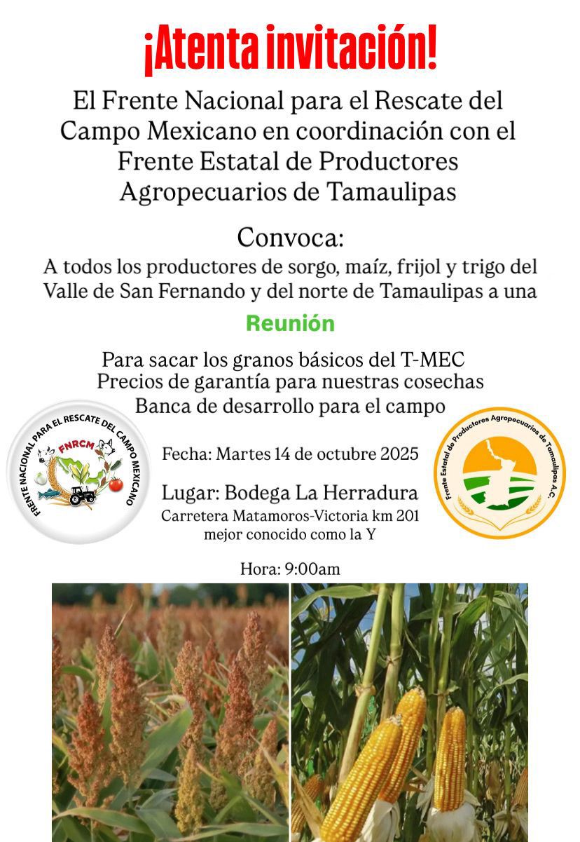 Reynosa, Tam.- Este próximo martes 14 de octubre se reunirán productores del campo para tomar acciones en defensa del maíz, frijol, sorgo y trigo, la cita será en la bodega “La Herradura” en punto de las nueve de la mañana.
