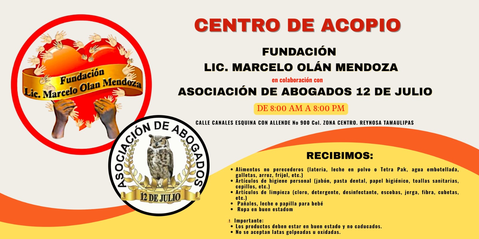 La dinámica dirigente, estableció que el acopio de alimentos no perecederos, ropa, medicamentos, agua, artículos de limpieza y demás artículos que se realiza en coordinación con la Asociación de Abogados 12 de Julio, se está realizando con gran éxito con la participación de centenares de reynosenses que se han hermanado con el dolor de quienes lo han perdido todo, particularmente los sectores más bajos de municipios situados al norte de Veracruz, como Poza Rica, del cual muchas colonias que aún se encuentran bajo el agua tras el desbordamiento de arroyos, ríos y canales.