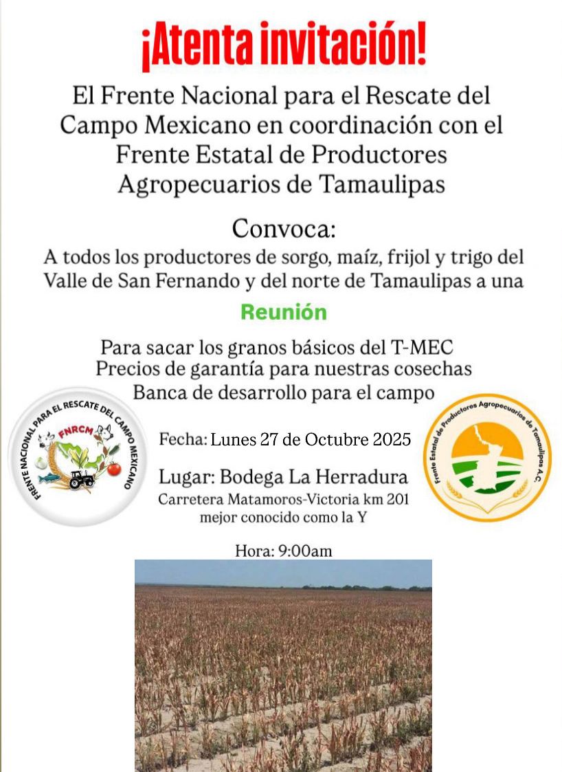 Ejidatarios, pequeños propietarios y todo productor está invitado a participar en esta asamblea que convoca la Frente Estatal de Productores Agropecuarios de Tamaulipas, en coordinación con el Frente Nacional de Rescate del campo mexicano.
