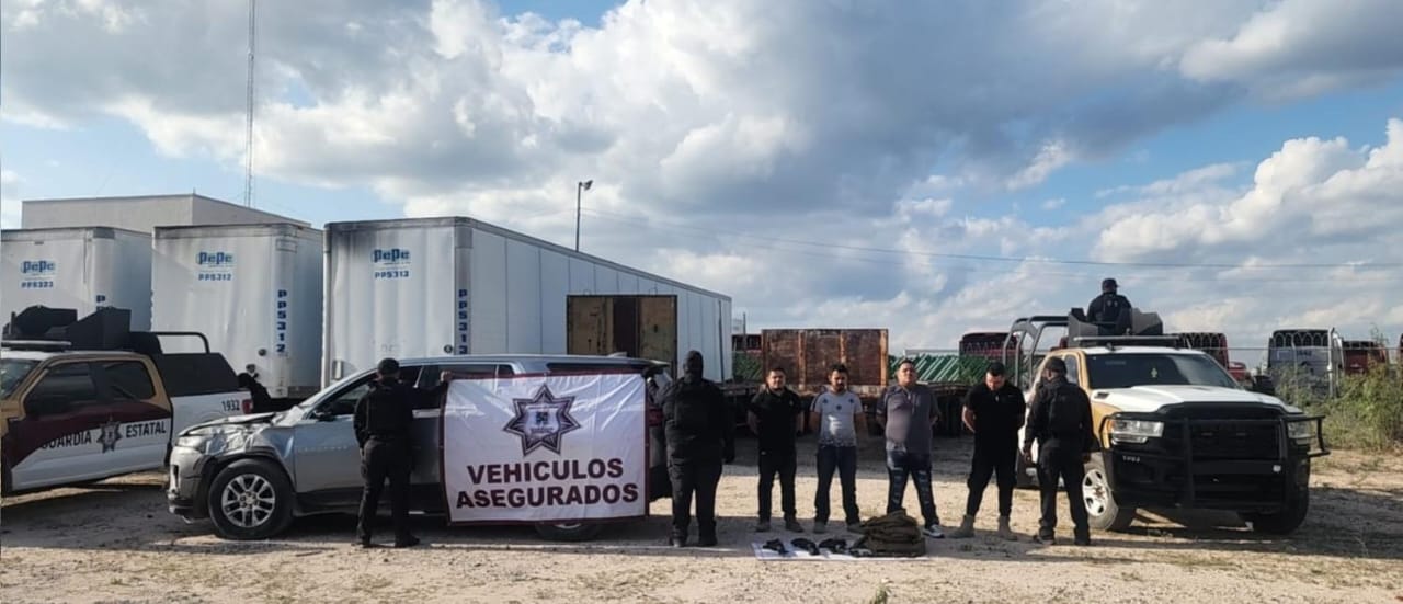 Durante recorridos de seguridad y vigilancia en la avenida Loma Real, detectaron un vehículo, por lo que los agentes le dieron seguimiento hasta un estacionamiento de tráileres, donde fueron interceptados cuatro masculinos armados.