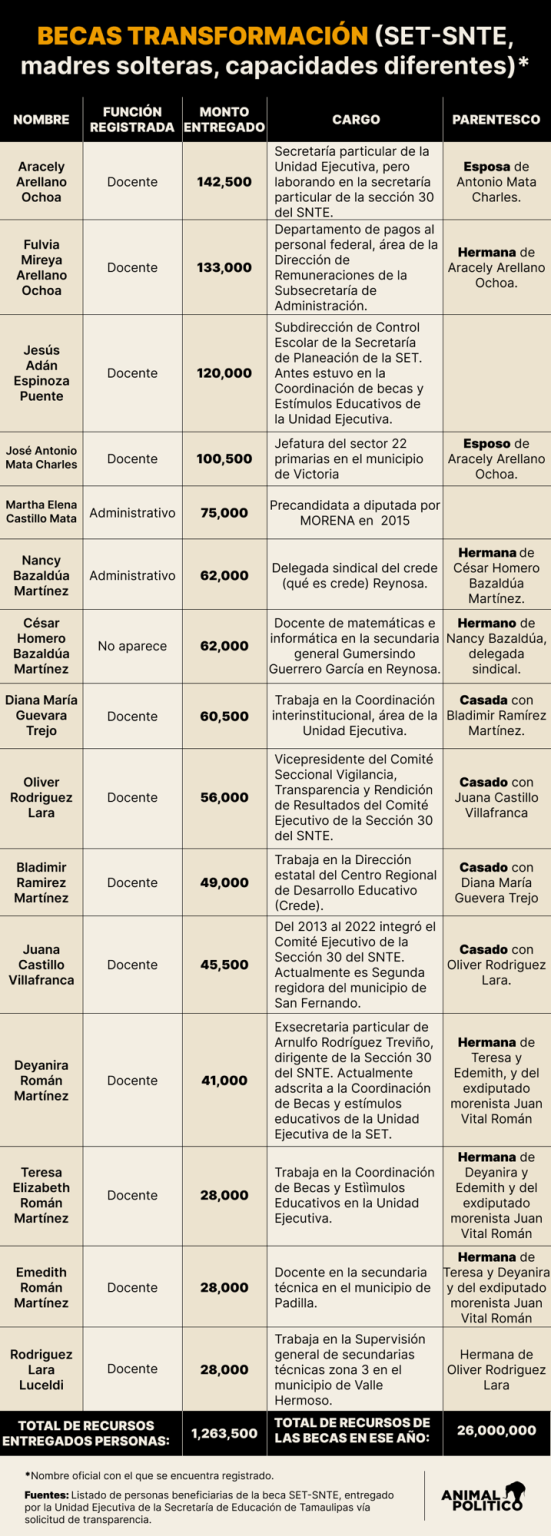 Además, las hermanas Deyanira y Teresa Elizabeth sumaron 69 mil pesos en 7 pagos, y su hermano Emedith, profesor de secundaria en Padilla, Tamaulipas, cobró 28 mil pesos.