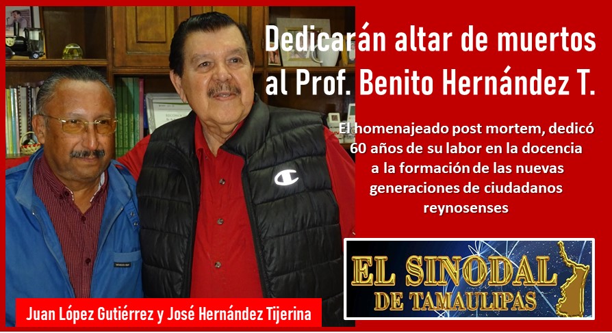 El director de la Escuela Secundaria No. 2 “Mario González Aguirre”, profesor José Hernández Tijerina, hermano del maestro Benito, indicó que le tocó este año al maestro Juan Lopez Gutiérrez, el trabajo de coordinar la construcción del altar que será colocado en un aula del plantel y donde han intervenido un gran grupo de maestros y alumnos en su elaboración para el disfrute de una de las grandes tradiciones de la cultura mexicana.