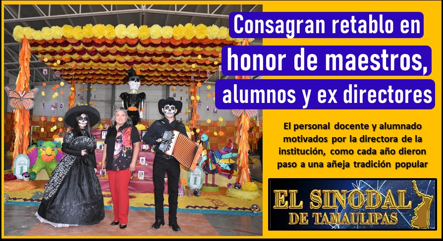 Reynosa, Tam.- Como cada año, docentes y directivos de la Escuela Secundaria General No 1, “José de Escandón” que dirige la maestra Edgui Larizza Cantú Gómez, han montado el tradicional altar de muertos.