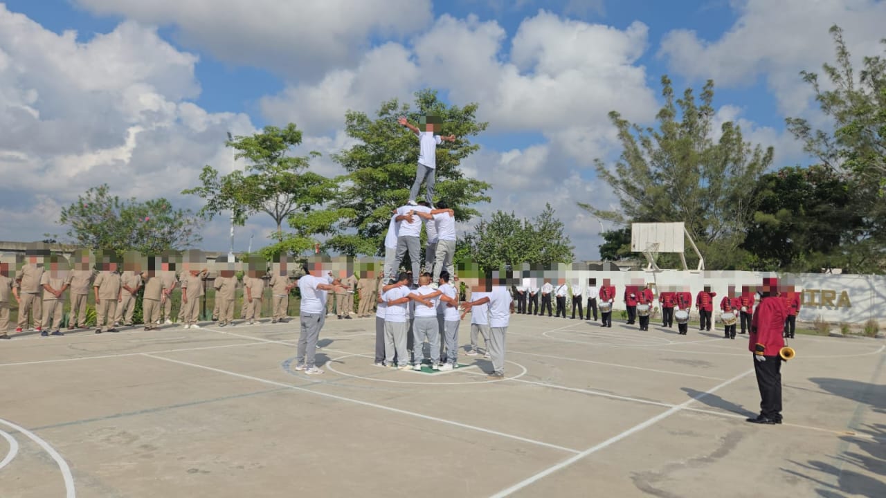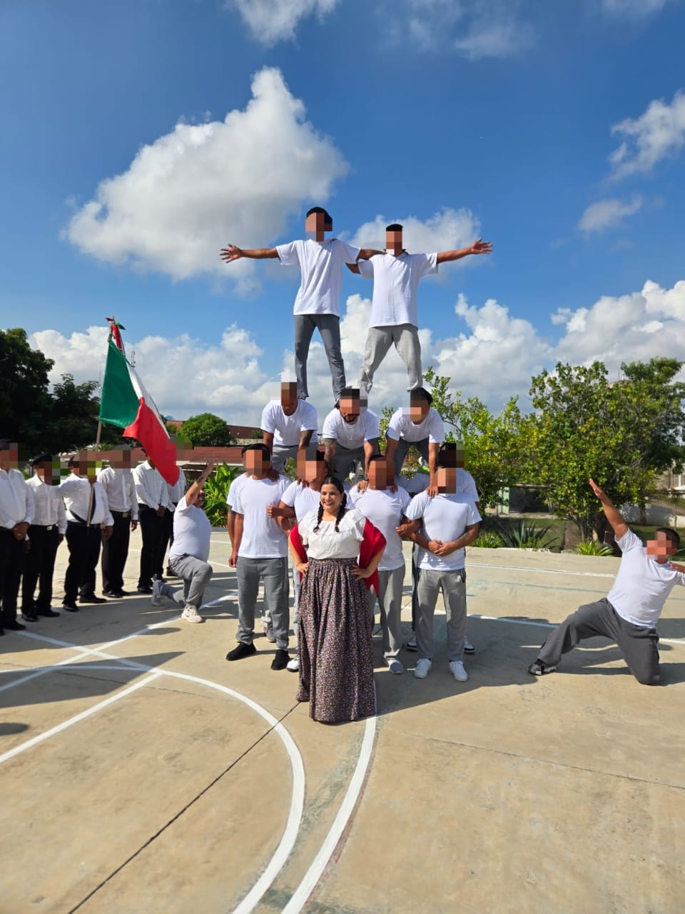 Esta actividad se desarrolló en la cancha deportiva del módulo seis, en este lugar, se llevaron a cabo las tradicionales pirámides que se presentan en los desfiles de esta fecha a nivel nacional.