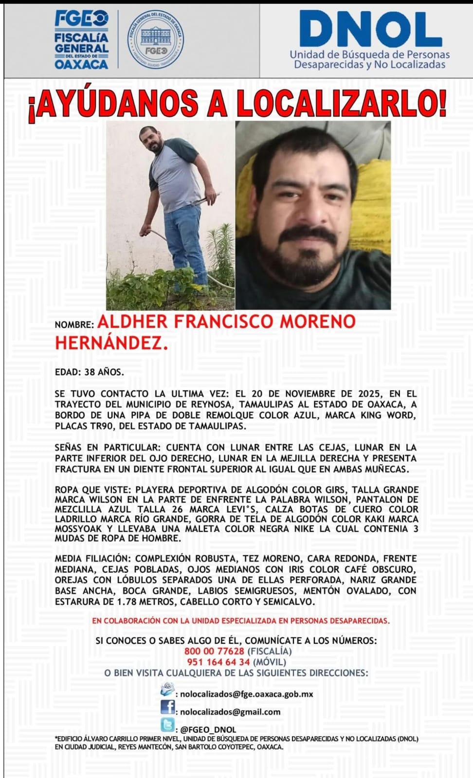 Méndez Ñeco señaló que las unidades fueron localizadas abandonadas días después. Hasta el momento, únicamente la familia de Aldher Francisco Moreno presentó una denuncia formal ante la Fiscalía General del Estado de Oaxaca, que ya emitió una ficha de búsqueda.