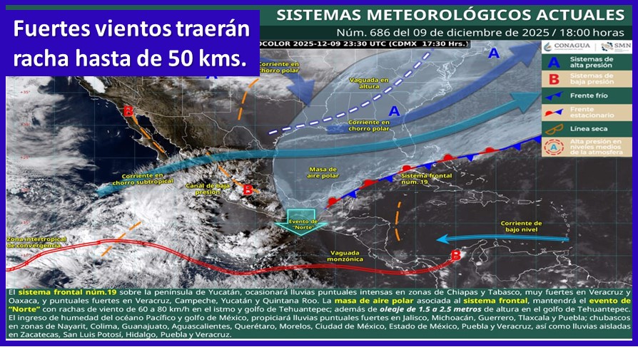 La CNPC agregó que el Frente Frío No. 19 permanecerá estacionario sobre el occidente del mar Caribe, favoreciendo lluvias fuertes y efectos meteorológicos en Yucatán, Tabasco, Quintana Roo y Chiapas. Las precipitaciones en el sureste podrían generar encharcamientos, aumento en niveles de ríos y posibles deslaves en zonas de ladera.