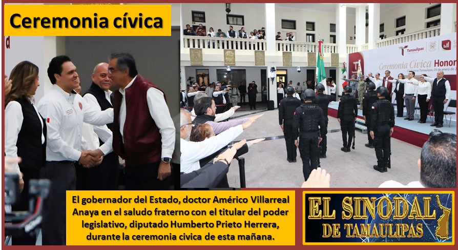Cd. Victoria, Tam.- El presidente de la Junta de Gobierno del Congreso Libre y Soberano de Tamaulipas, Humberto Prieto Herrera, este lunes 5 de enero de 2026, atendió la invitación del Gobernador Américo Villarreal Anaya, asistiendo a la ceremonia cívica de honores a la bandera en Palacio de Gobierno.