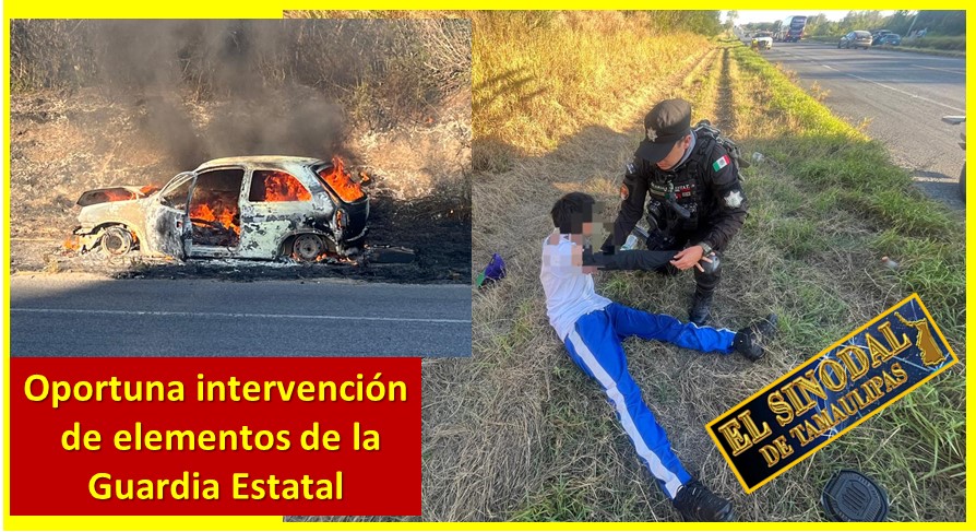 Hidalgo, Tamaulipas.- Personal de la Guardia Estatal de Apoyo Carretero atendió un accidente de tránsito registrado en el kilómetro 54 de la Carretera Federal 85, tramo Victoria–Monterrey, que dejó como saldo a un menor de edad con quemaduras, luego de que un vehículo en que viajaba se incendió tras el percance.