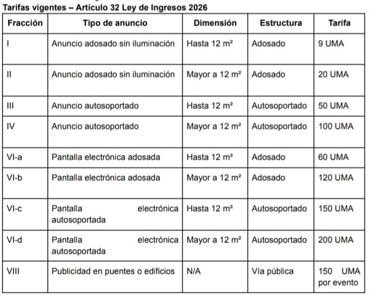 A partir de 2026, el cobro de derechos por anuncios ya no se determinará únicamente por metros cuadrados, sino que ahora considerará el tipo de estructura —adosada o autosoportada— y la tecnología utilizada, ya sea tradicional o electrónica. Este nuevo modelo permitirá que las tarifas se ajusten al impacto real de cada tipo de anuncio.