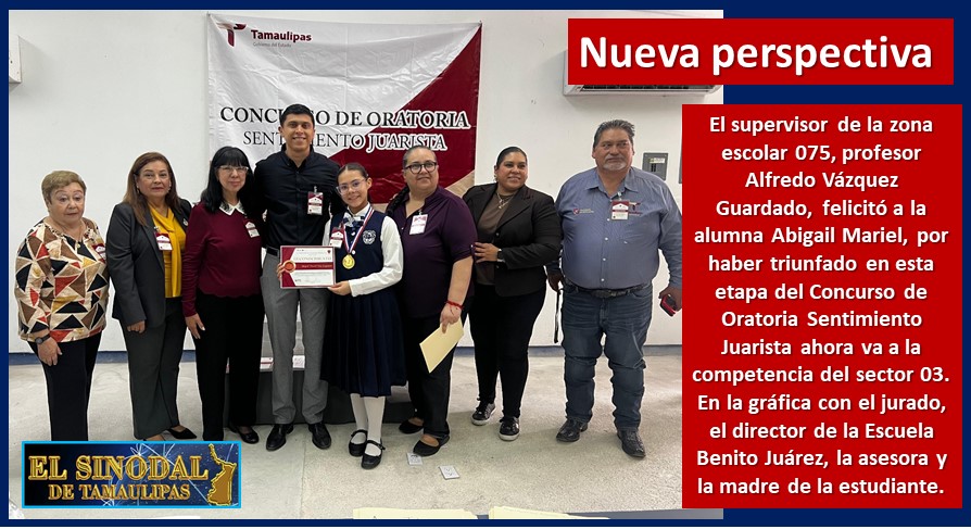 Reynosa, Tam.-La alumna Abigail Mariel Vera Anguiano del sexto grado grupo “A” de la Escuela Benito Juárez, obtuvo a juicio del estricto jurado calificador, el mejor puntaje en el Concurso de Oratoria Sentimiento Juarista en la etapa de la zona 075, perteneciente al sector 03 del nivel primarias.