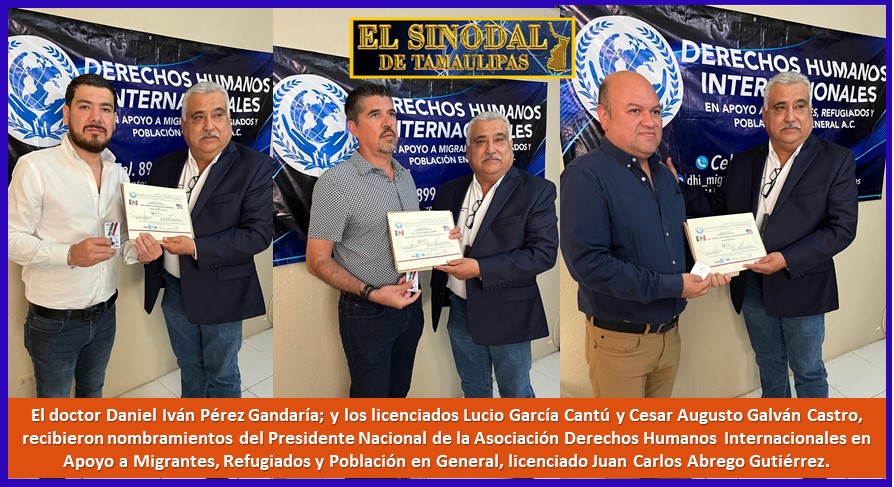 Reynosa, Tam.- Conforme a su proyecto expansionista, la Asociación Derechos Humanos Internacionales en Apoyo a Migrantes, Refugiados y Población en General, hizo entrega de tres nuevos nombramientos a distinguidos ciudadanos que desde ya se han integrado a las filas de la más grande organismo no gubernamental de la frontera de México.