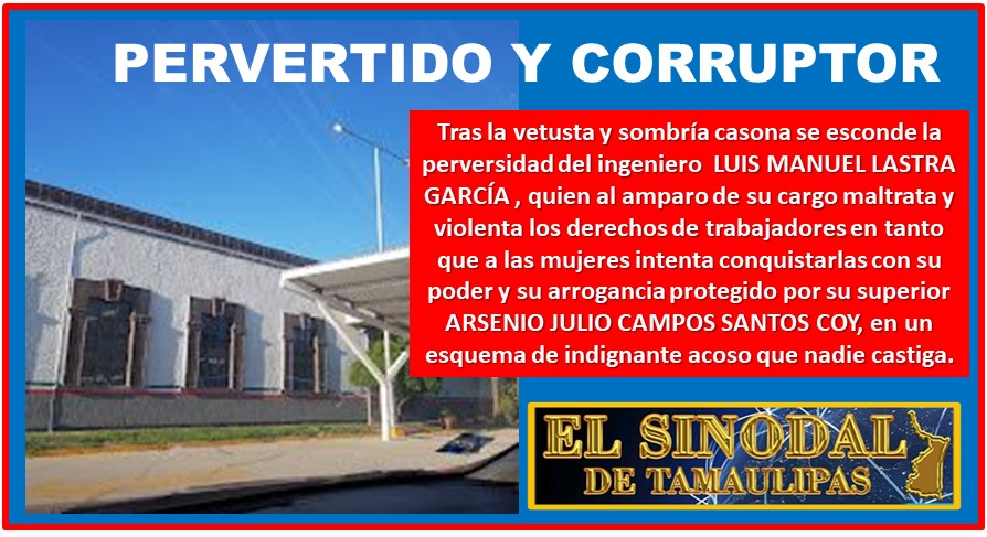 El despido fue orquestado para complacer al corruptor en uno más de sus caprichos y rabietas, sumándose este a otro número de funcionarios que al estorbarle en sus “negocios personales” al Interior de la Unidad Regional Reynosa al ING. LUIS MANUEL LASTRA GARCIA Subgerente Técnico de CAPUFE, también pasaron a formar parte de las estadísticas de desempleo y para precisar el título de esta nota es precisamente que a estas fechas no ha habido quien se haya dignado al Interior de este organismo a ponerle un alto y a hacer justicia ante sus malos manejos y nefastas actitudes de falta de respeto a los Derechos de las Mujeres.