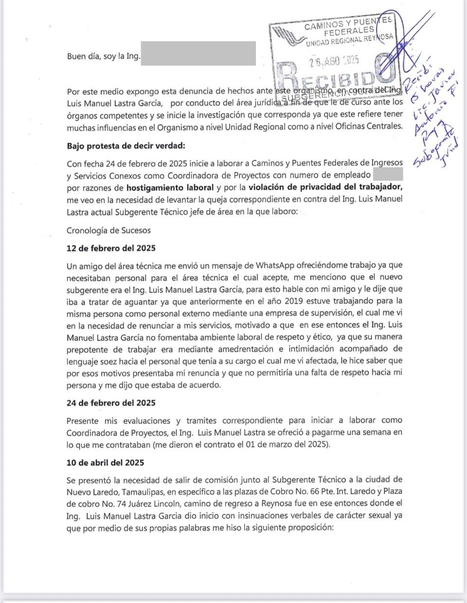 Los individuos de marras, aprovechándose de su posición han permitido, solapado y ejecutado una serie de malos tratos hacia buena parte del personal al interior de la mencionada Dependencia Publica, despidiendo personal que no sede ante los caprichos de” ING. LUIS MANUEL LASTRA GARCIA, como es el caso de una Joven Profesionista, Ingeniera Civil de quien solo daremos sus iniciales, A.A.H.O. esto por respeto a su identidad y datos personales, de quien queriéndose aprovechar por ver que aparentemente estaba sola, la hizo víctima de un trato soez, tratándola con múltiples majaderías y adoptando una actitud peligrosamente acosadora.